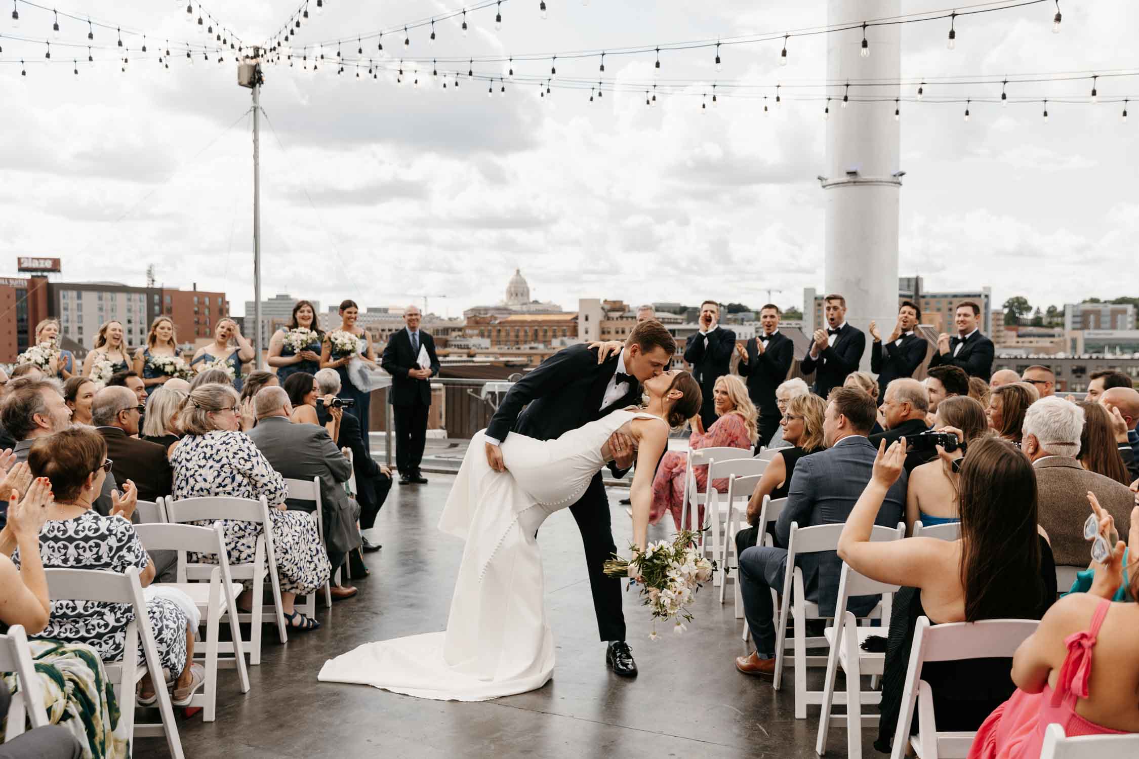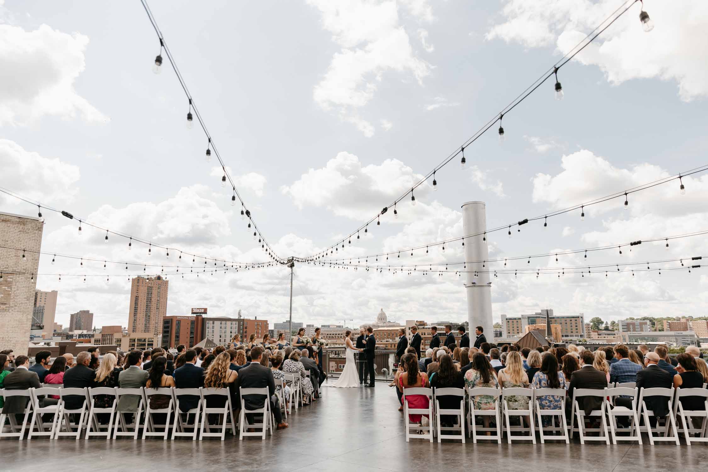 Say “I do” beneath the open sky on our rooftop ceremony site, where the panoramic St. Paul skyline creates a breathtaking backdrop. With sweeping city views surrounding you, this one-of-a-kind setting is perfect for couples dreaming of a truly unforgettable outdoor ceremony experience.