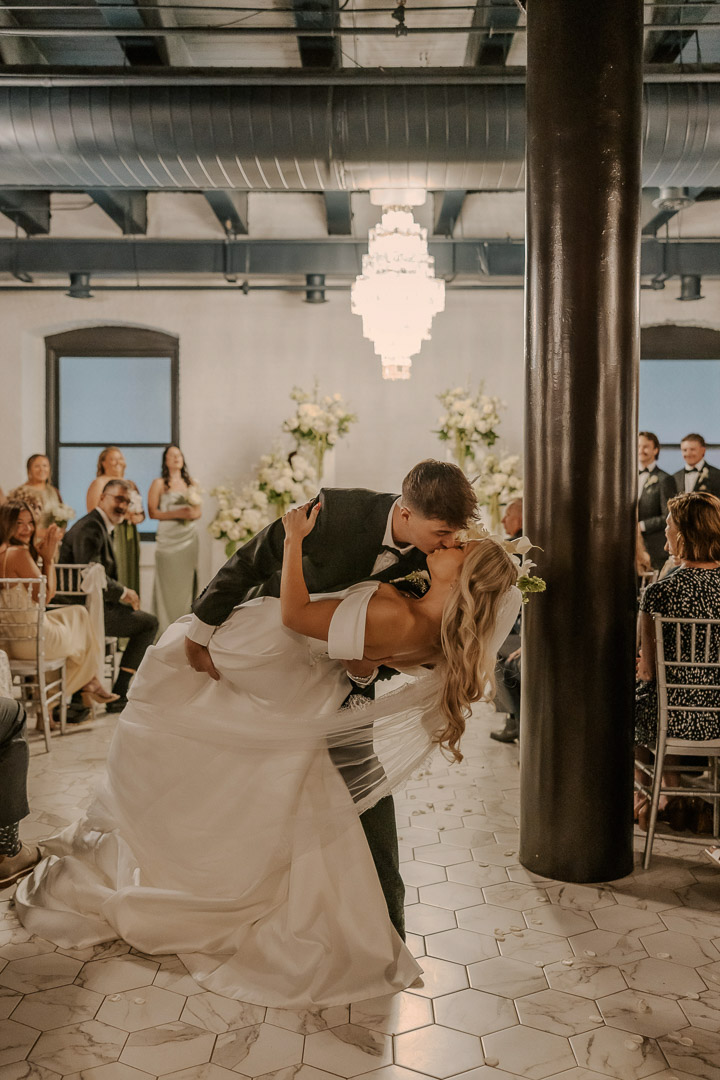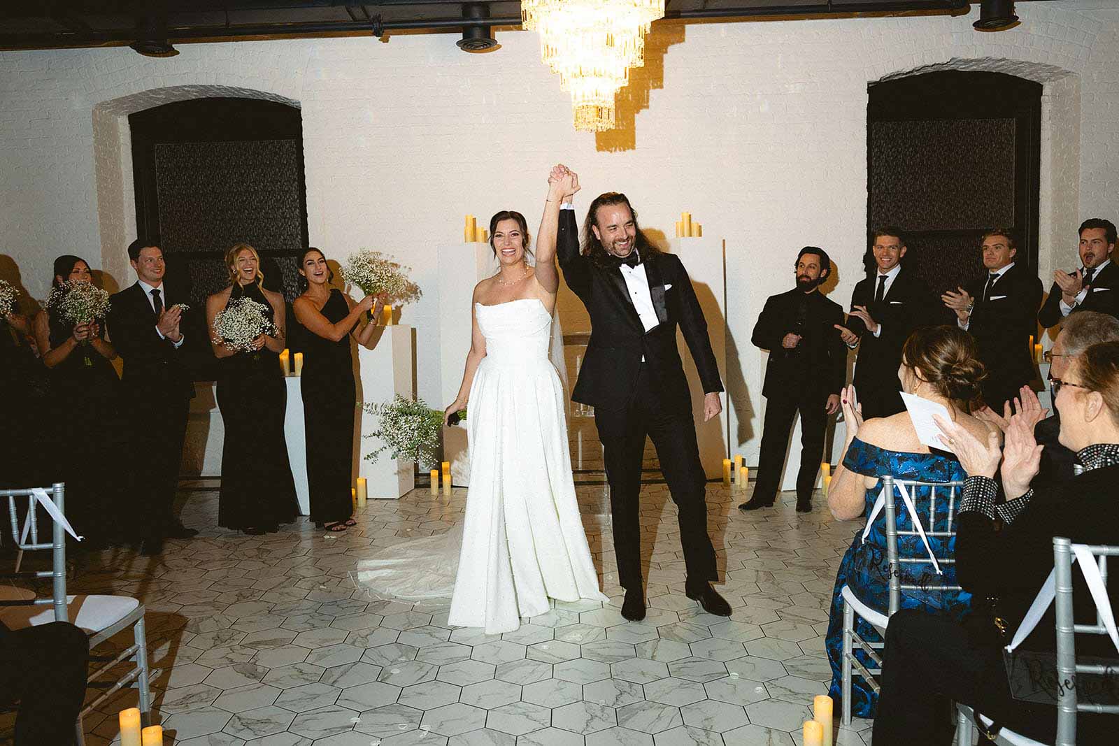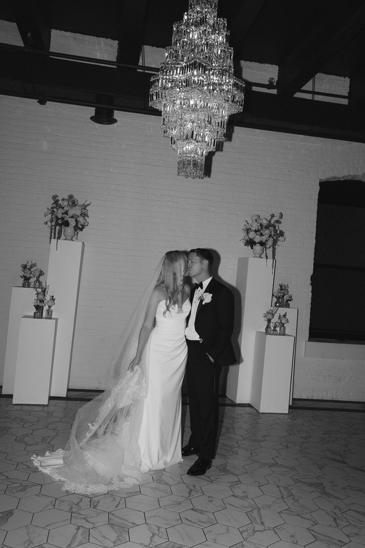Our indoor ceremony space at Le VENERÉ is timeless and refined, designed to feel both grand and intimate. Soft white brick, marble-inspired flooring, and sculptural crystal chandeliers create a setting that’s elegant without feeling overdone. Black-trimmed windows and glowing golden light add just the right amount of mood and contrast. It’s a stunning space to exchange vows and begin your celebration.