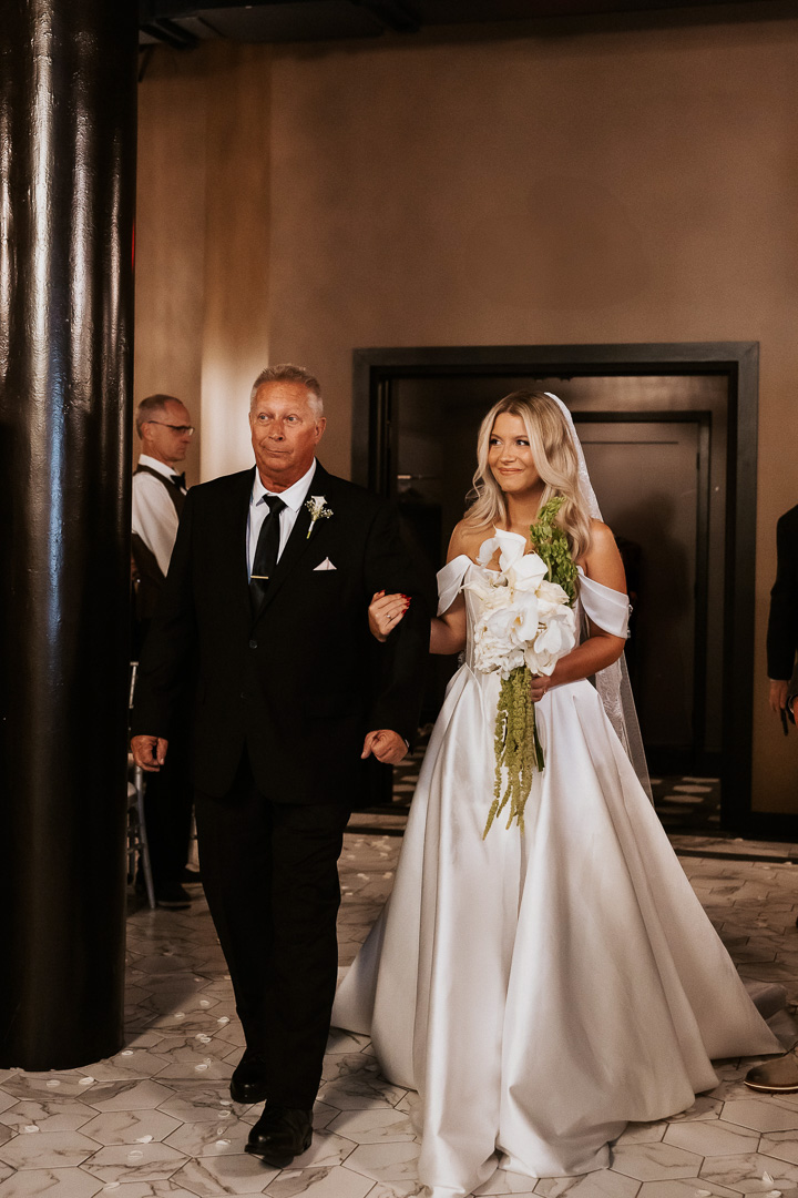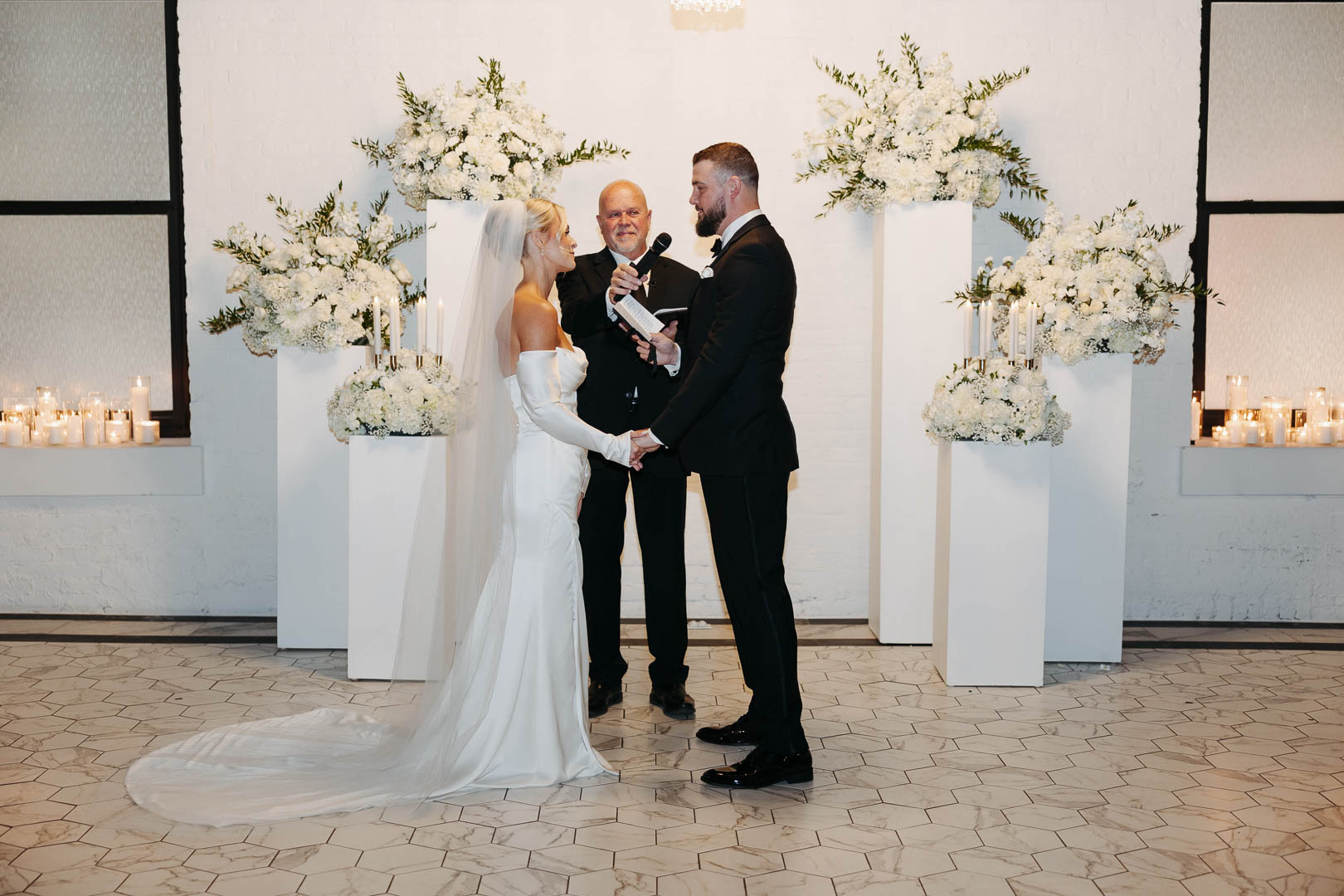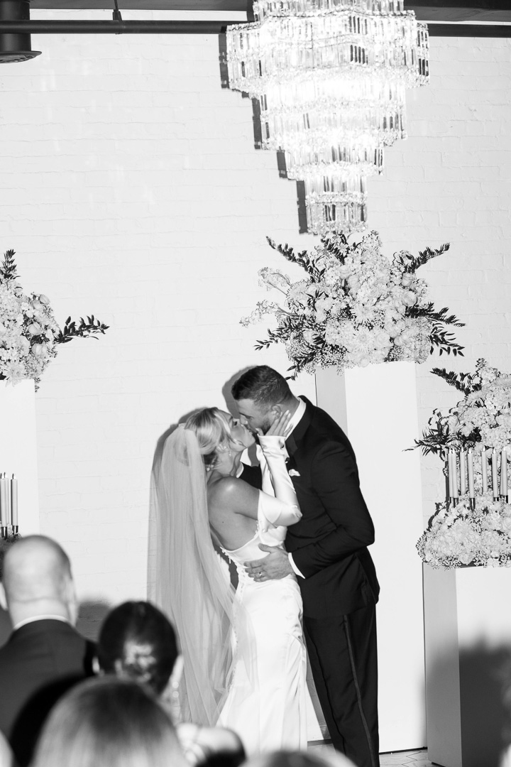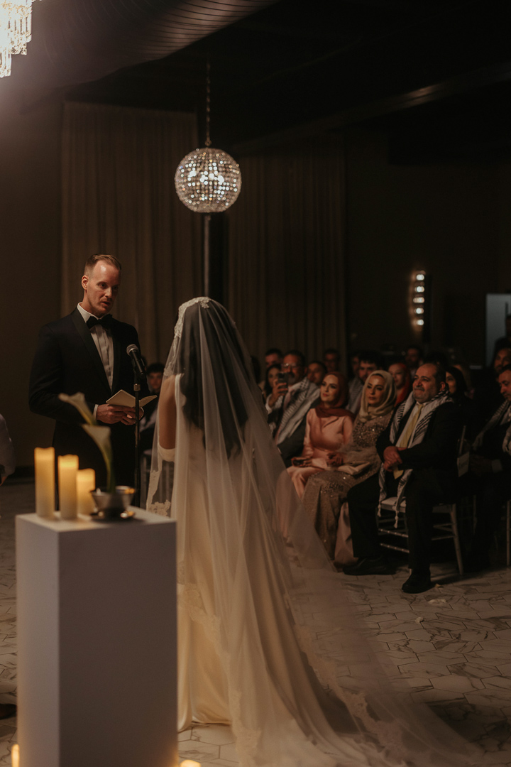 Our indoor ceremony space at Le VENERÉ is timeless and refined, designed to feel both grand and intimate. Soft white brick, marble-inspired flooring, and sculptural crystal chandeliers create a setting that’s elegant without feeling overdone. Black-trimmed windows and glowing golden light add just the right amount of mood and contrast. It’s a stunning space to exchange vows and begin your celebration.